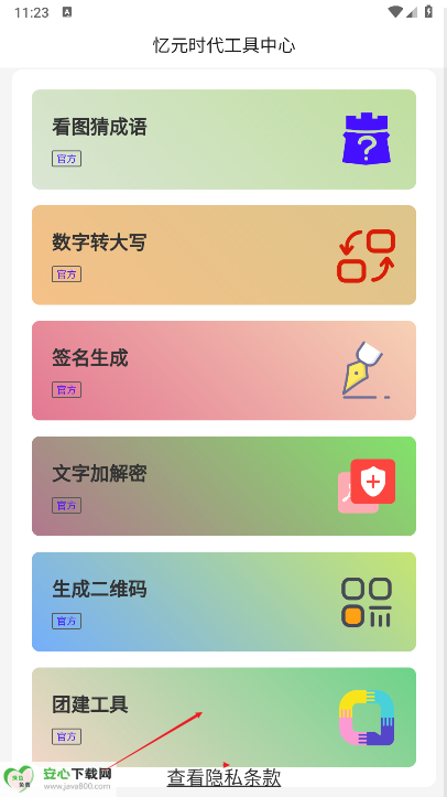 1.基础功能默认解锁:安装应用并打开后,无需任何额外操作,看图猜成语、数字转大写、签名生成、文字加解密(基础算法)、生成二维码(基础样式)、团建工具(基础方案库)等核心功能已全部开放,可直接点击对应模块使用。