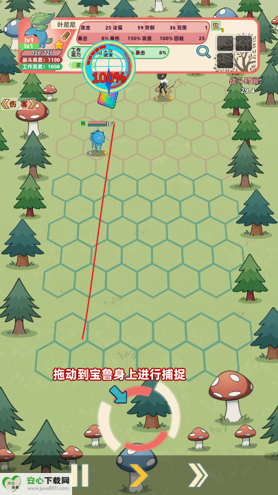 (ps:这样的捕获机制存在着一些致命的毒点,比如玩家在前期可能会因为每局内的捕获卡roll值不高,导致完全抓不到想要的宝鲁,失去了捕捉的概率性,这点对于前期萌新玩家来说可能会是个毒点,以及可能开局查看捕获卡的roll值后发现普遍低于60%时,并且局内宝鲁低生命时的百分比值低于40%,会出现一整局都抓不到宝鲁的情况,这个运气差时遇到会特别折磨;使用蓝色捕获卡后并在科技研究台升级捕获值可以使捕获体验提高一些,同时运用这个机制辅助捕捉,不过笔者还是有向制作者反馈捕获机制的毒点,后续不确定是否会优化调整,请期待后续更新)