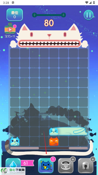 特殊技能(顶部消除):当顶部堆积大量猫咪方块难以处理时,点击道具栏对应图标,即可瞬间清除最上方一整行猫咪,快速缓解“置顶危机”,尤其适合应对方块即将堆满屏幕的紧急情况。