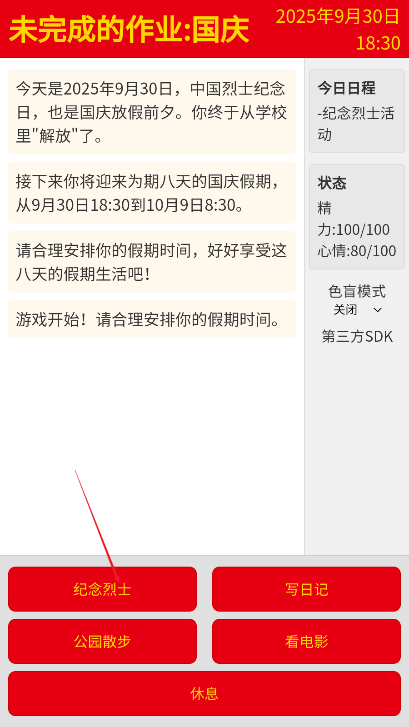 更棘手的是,小宇发现自己的“精力值”仿佛有了实体——熬夜打游戏会让第二天精神萎靡,根本没法专心听课;连续参加户外活动虽开心,却会累到连作业题目都看不进去。而假期中还藏着意外惊喜:若能在中秋当晚陪爷爷去公园赏月,可能会触发“听爷爷讲过去的故事”的特殊剧情;若按时完成每日的英语打卡,或许能解锁同学组织的“国庆读书会”活动。