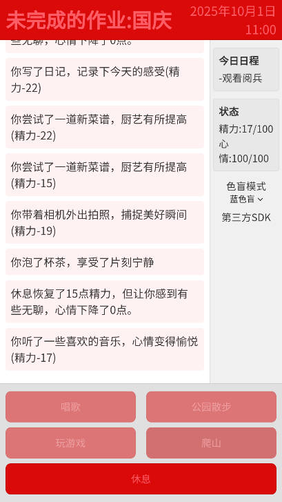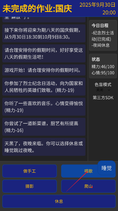 呈现形式与体验优化层面纯文字的呈现方式简洁直观,能让玩家专注于剧情与决策,但也缺乏视觉吸引力:界面设计较为朴素,无角色立绘、场景插图等辅助元素,长期游玩易产生视觉疲劳。此外,部分特殊活动的触发条件过于模糊,例如“解锁读书会”需要的具体行为未给出任何提示,导致玩家可能错过关键剧情,建议在游戏中增加“假期手册”功能,隐晦提示隐藏活动的触发方向,提升探索体验。