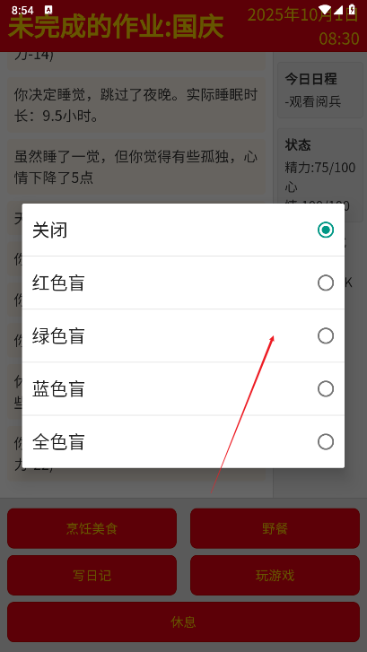 未完成的作业国庆游戏安卓版(com.zhkg.zhijian)是一款充满轻松氛围的文字冒险游戏,玩家将体验一个特别的假期生活。游戏设定在国庆和中秋假期,玩家将扮演一名学生,度过八天充实的假期。在这段时间里,你将面临选择,决定是否参与各种活动或选择休息!