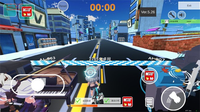 道具玩法:可拾取导弹/香蕉皮/闪光弹干扰对手,部分角色具备专属技能(如直升机空中优势)。